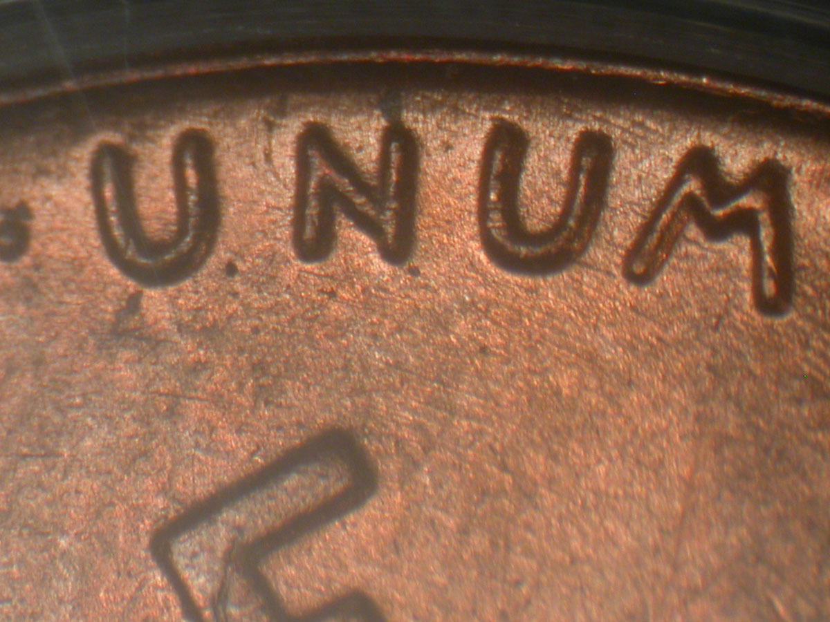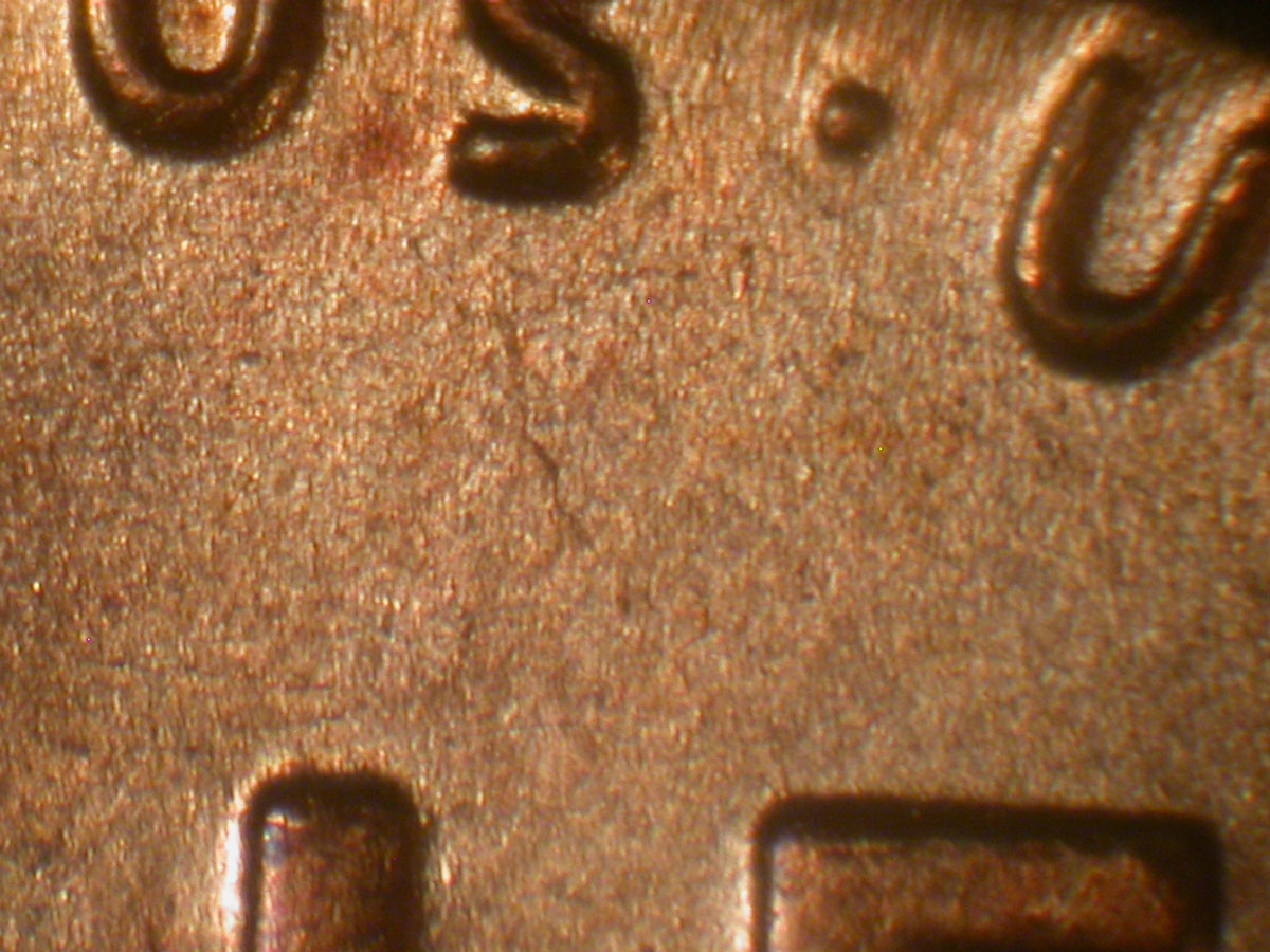 Die crack from E of ONE to S of PLURIBUS LDS