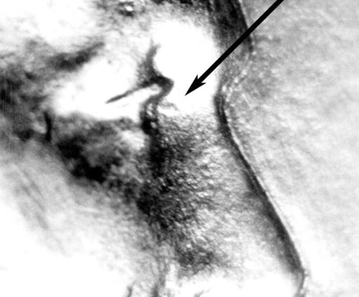 Die crack from Right leg of the second U of PLURIBUS South to the Right leg of N of CENT