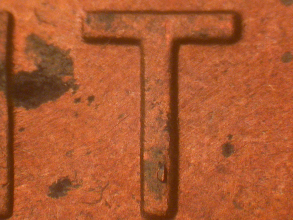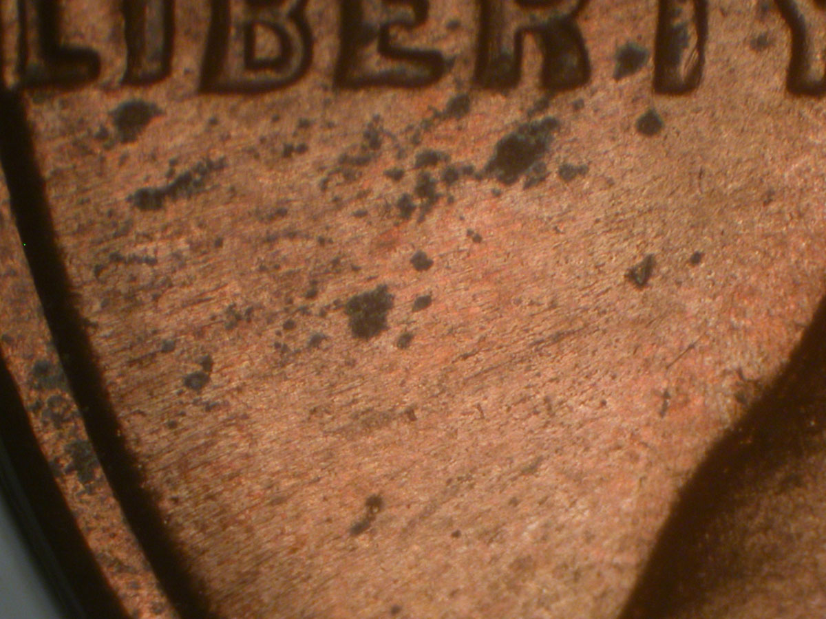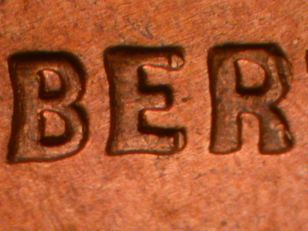 Die gouge dot in lower field under E of LIBERTY MDS
