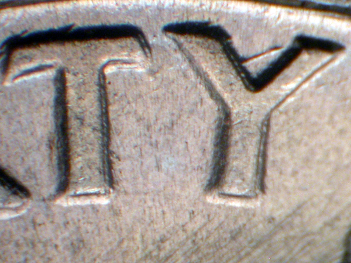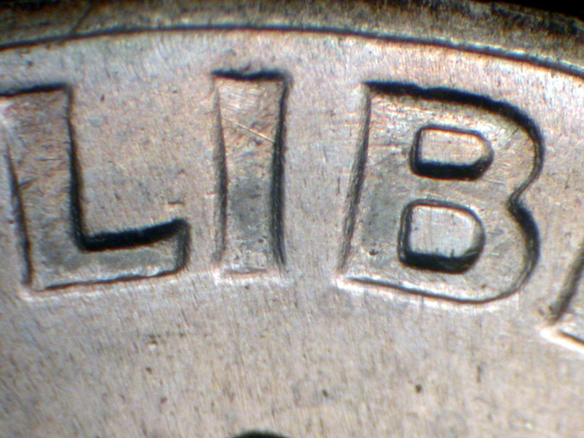 Medium spread on LIBERTY, eyelid, and profile from center-top of head to