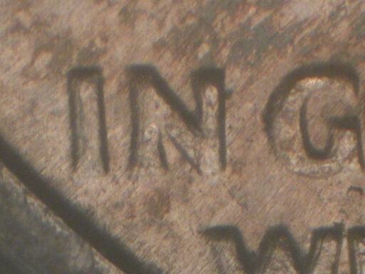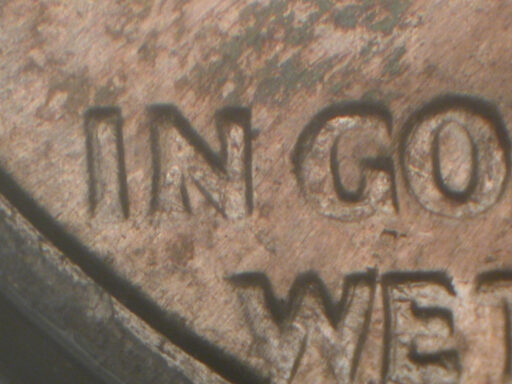 Light spread on IN GOD WE TRUST, designer's initials side by side and date