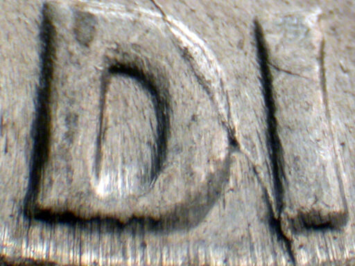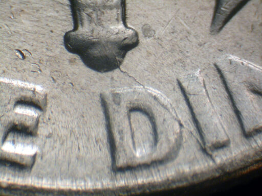 Die crack Left stem to rim through I of DIME