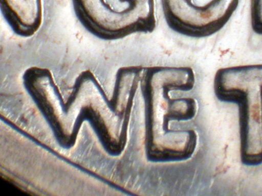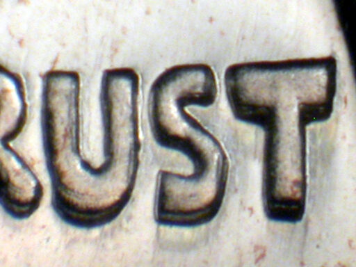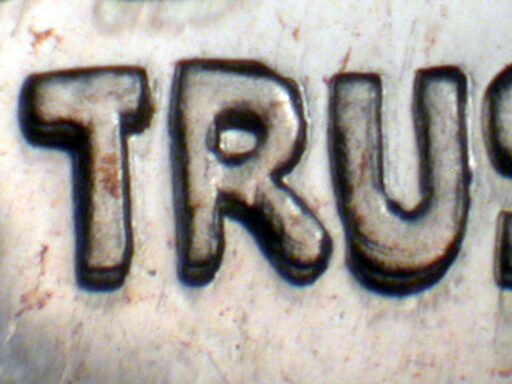 Light quad spread on TRUST and designer's initials, with light spread on date, IN