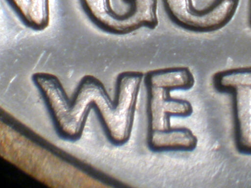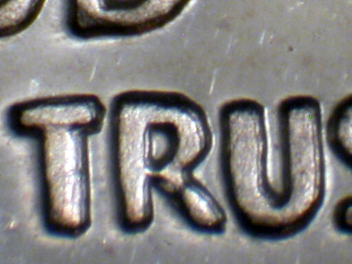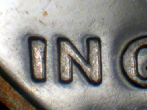 Light spread on IN GOD WE TRUST and designer's initials side by side