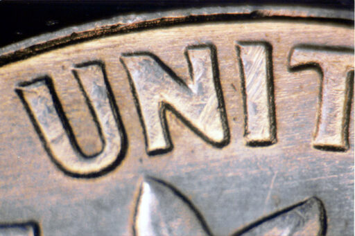 Die crack from second leaf to rim through E of UNITED