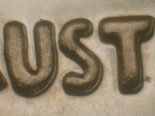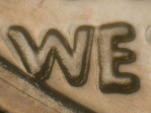 Light spread on date, designer's initials, and WE TRUST
